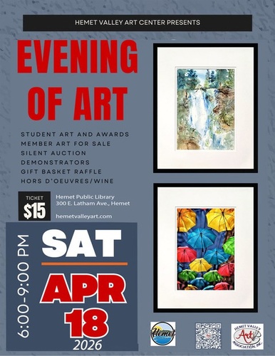 Hemet Valley Art Assoc.'s biggest event of the year, our 19th Annual Evening of Art will be held at the Hemet Public Library in Hemet on April 18, 3-6 pm. The afternoon of the the event, student art, curated by their teachers, are blind judged in 5 categories: Painting-2D, Other Media - 2D, Photography, Digital Art, and 3D Art. In a ceremony that evening, cash awards are presented to the 1st-4th place winners. The students' art is on display as is art from the association's gallery on Harvard. There's a basket raffle, silent auction, and live artist demonstrations throughout the evening. Hors d'oeuvres and wine are provided. Tickets $15. You can pick yours up at the gallery @144 N. Harvard, Tue-Sat., 10:00 am-4:00 pm. up until the day before the event or get them at the door at no additional charge. Your attendance helps fund the event for next year.
