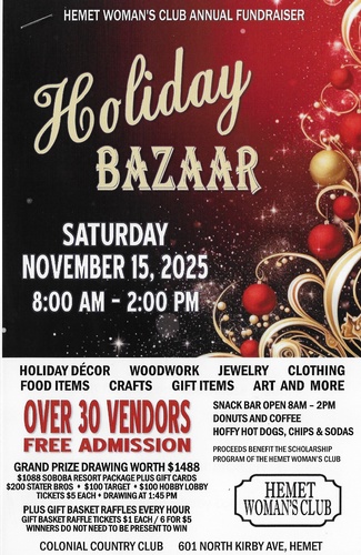 Over 30 Vendors: Holiday decor, woodwork, jewelry, clothing, food items, crafts, gift items, art and more. Snack bar: Donuts and coffee, Hoffy hot dogs, chips & soda.