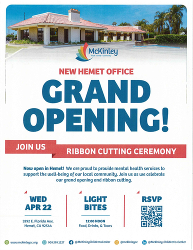 Please Join the McKinley team in celebration of our newest location. We have outgrown our space and are moving to a new location located at 2392 E. Florida Ave, Hemet. This new building will provide office space, therapy rooms and a beautiful training room. We request you RSVP, to aid in gathering an appropriate heat count as light bites will be provided.