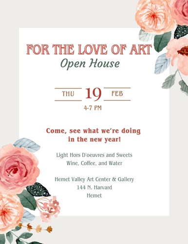 Open House at the Hemet Valley Art Association's art center and gallery. Come mingle with other artists and see what we're all about! Hors d'oeuvres will be available. Drop in anytime. Event is free. Lots of parking just to the south of the building and behind it.