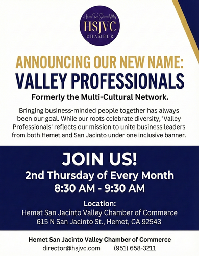 Bringing business-minded people together has always been our goal. While our roots celebrate diversity, 'Valley Professionals' reflects our mission to unite business leaders from both Hemet and San Jacinto under one inclusive banner.
